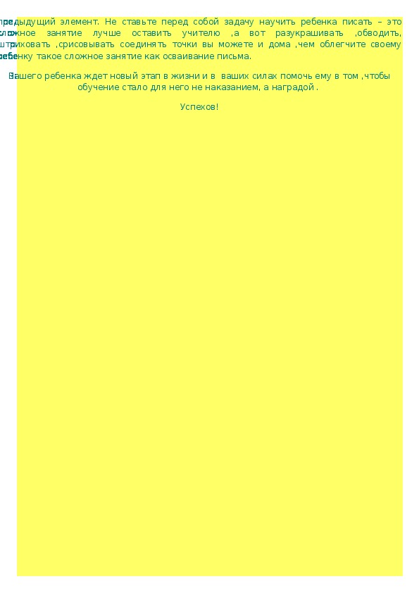 усложняйте узор ,пока не отработаетепредыдущий элемент. Не ставьте перед собой задачу научить ребенка писать – это