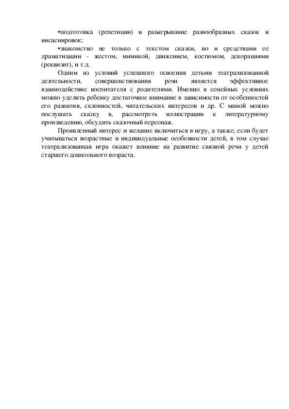 Одним из условий успешного освоения детьми театрализованной