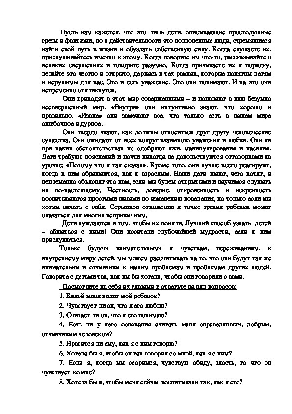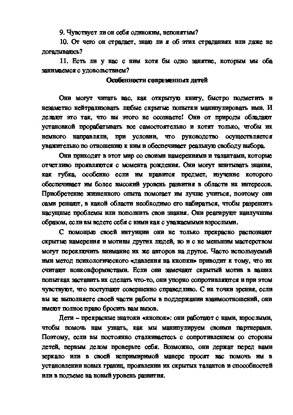 8. Хотела бы я, чтобы меня сейчас воспитывали так, как я его?9. Чувствует ли он себя одиноким, непонятым?