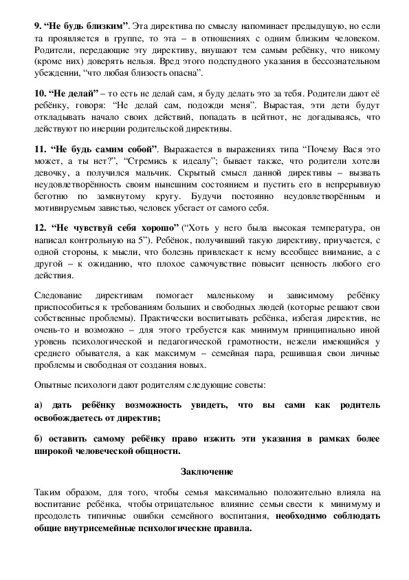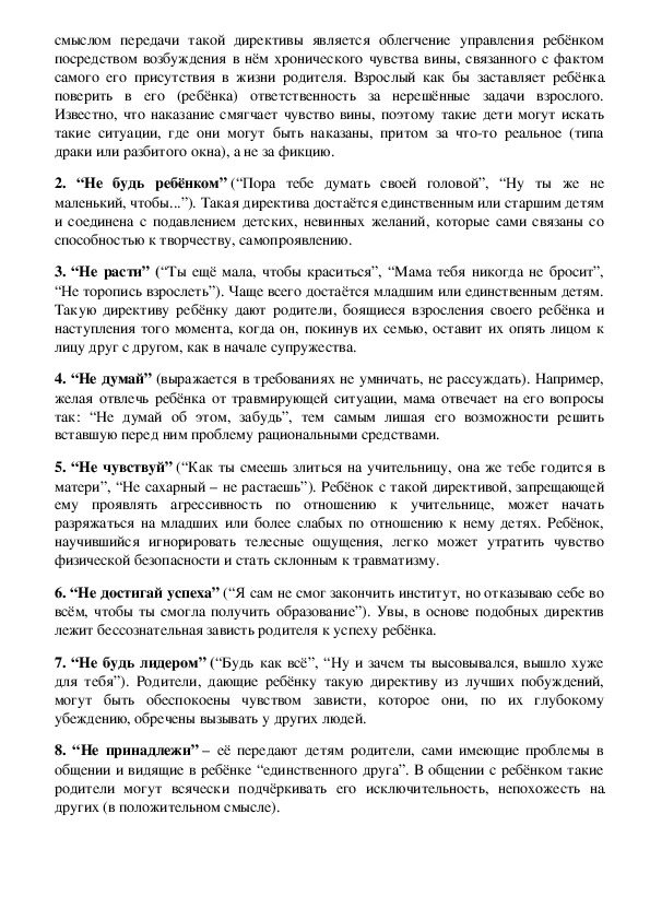 здоровье отдала, чтобы тебя воспитать, я так и не смогла...” и т.д..) Скрытымсмыслом передачи такой директивы является облегчение управления ребёнком