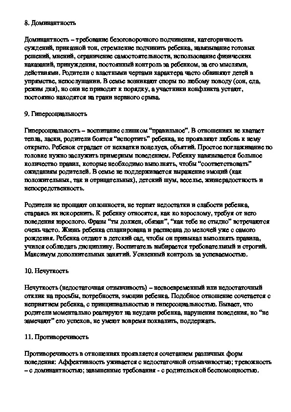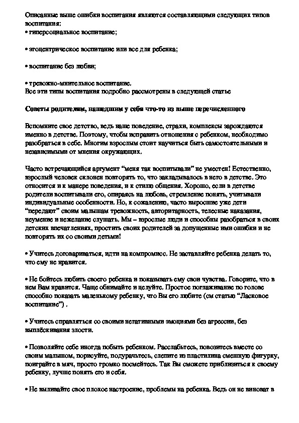 – с доминантностью; завышенные требования с родительской беспомощностью.Описанные выше ошибки воспитания являются составляющими следующих типов