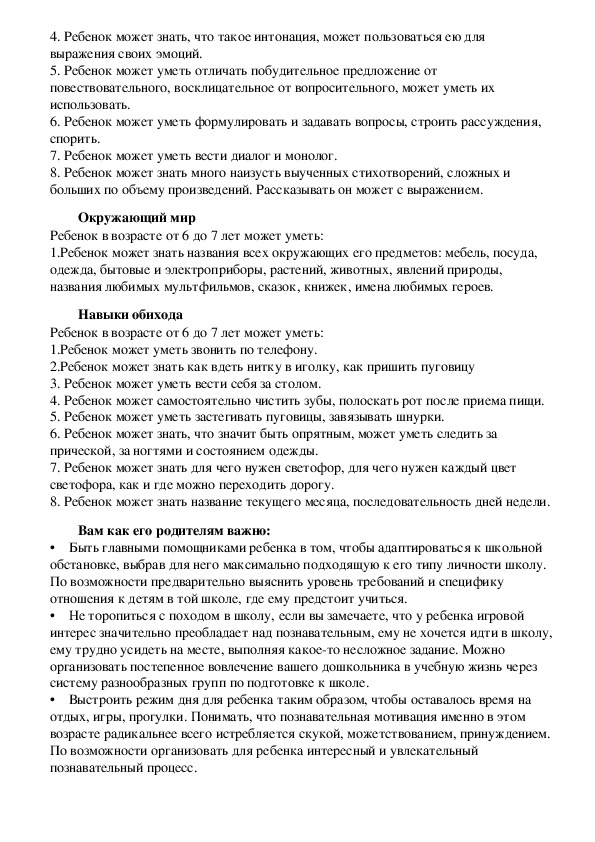 Практически готов к расширению своего микромира, если им освоено умение взаимодействовать со сверстниками и взрослыми. Ребенок, как правило, в состоянии воспринять новые правила, смену деятельности и те требования, которые будут предъявлены ему в школе.