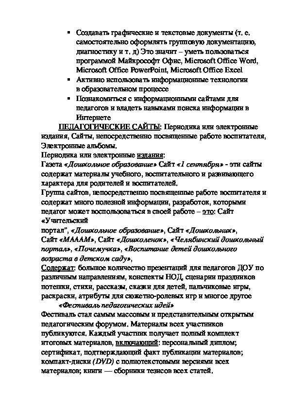 Создавать графические и текстовые документы (т. е. самостоятельно оформлять групповую документацию, диагностику и т. д) Это значит – уметь пользоваться программой Майкрософт Офис, Microsoft Office Word, Microsoft Office PowerPoint, Microsoft Office Excel