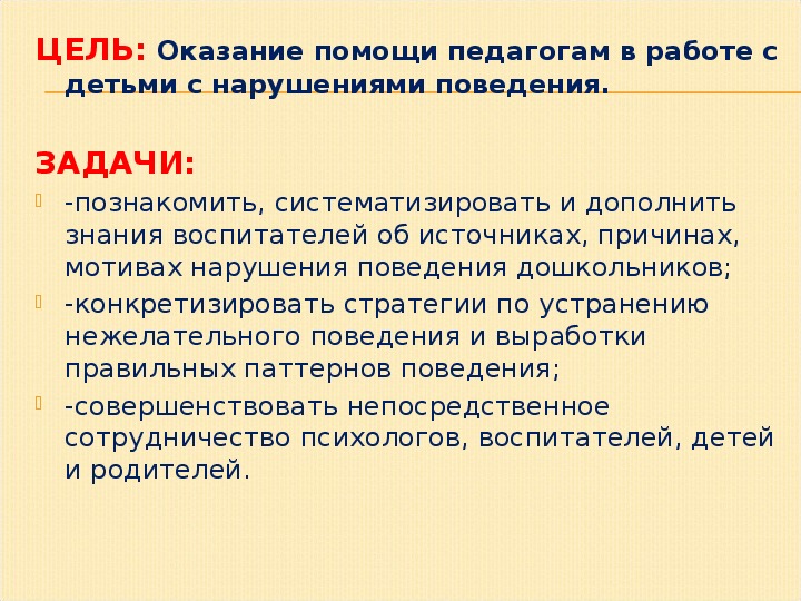 ЦЕЛЬ: Оказание помощи педагогам в работе с детьми с нарушениями поведения.
