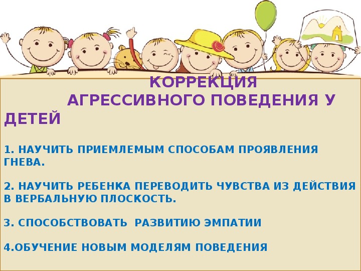 3. Способствовать развитию эмпатии. Агрессивный ребенок слабо осознает собственные эмоции и игнорирует эмоции окружающих. Развитие эмпатии является важнейшим моментом в деле коррекции агрессивного поведения.