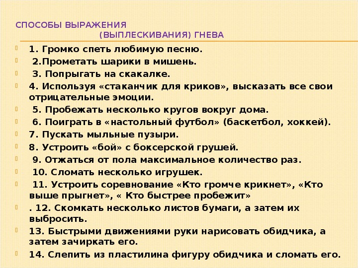 1. Научить приемлемым способам проявления гнева. Какие формы проявления гнева вы считаете приемлемыми?