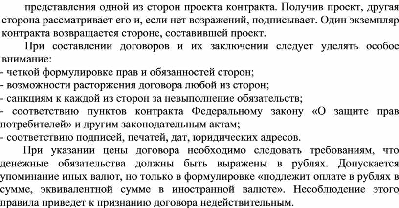 При указании цены договора необходимо следовать требованиям, что денежные обязательства должны быть выражены в рублях. Допускается упоминание иных валют, но только в формулировке «подлежит оплате в рублях в сумме, эквивалентной сумме в иностранной валюте». Несоблюдение этого правила приведет к признанию договора недействительным.