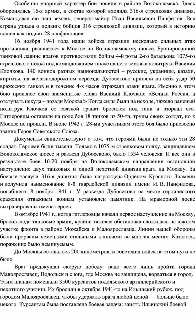 Особенно упорный характер бои носили в районе Волоколамска. Здесь оборонялась 16-я армия, в состав которой входила 316-я стрелковая дивизия. Командовал ею наш земляк, генерал-майор Иван Васильевич Панфилов. Вся страна узнала о подвиге бойцов 316 стрелковой дивизии, который в историю вошел как подвиг 28 панфиловцев.