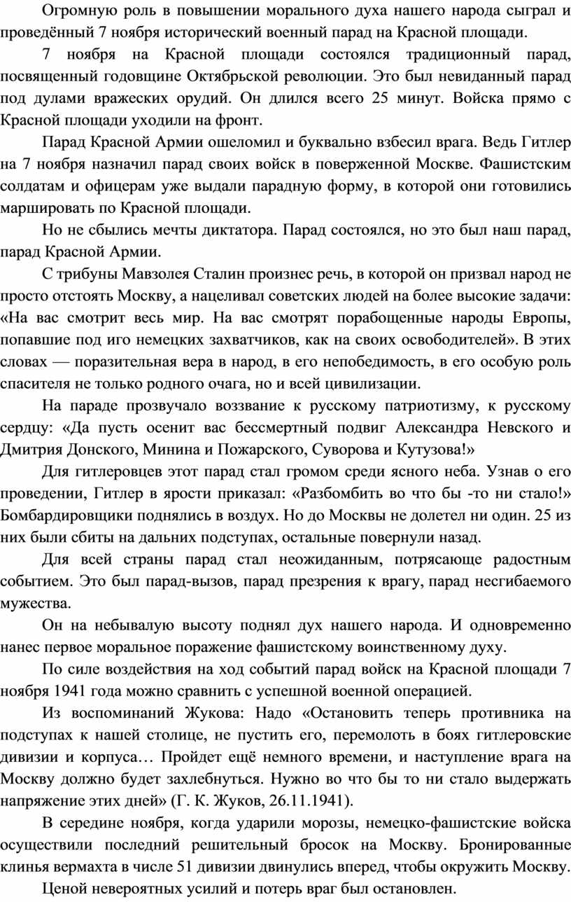 Огромную роль в повышении морального духа нашего народа сыграл и проведённый 7 ноября исторический военный парад на Красной площади.