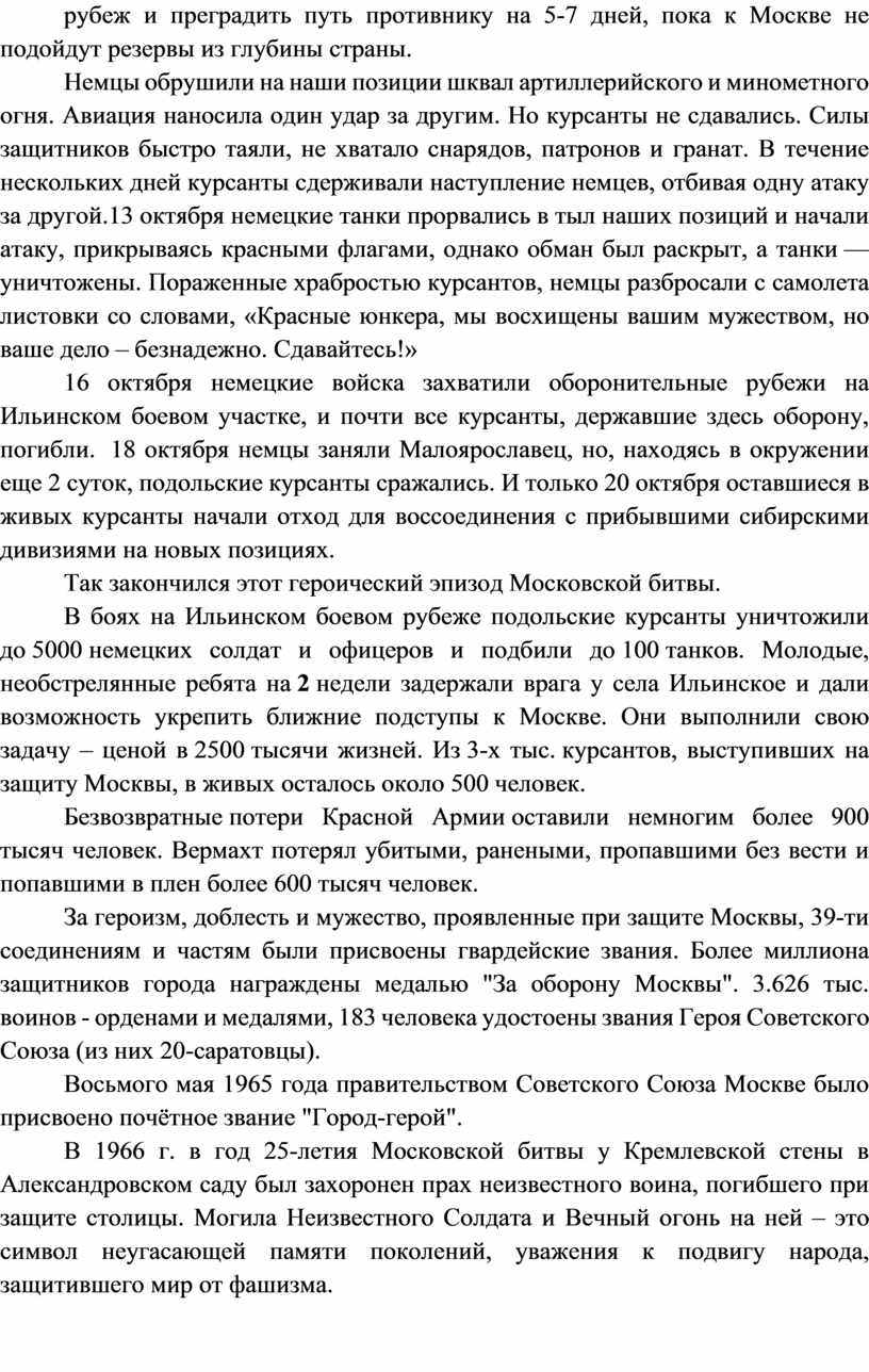 В боях на Ильинском боевом рубеже подольские курсанты уничтожили до 5000 немецких солдат и офицеров и подбили до 100 танков. Молодые, необстрелянные ребята на 2 недели задержали врага у села Ильинское и дали возможность укрепить ближние подступы к Москве. Они выполнили свою задачу – ценой в 2500 тысячи жизней. Из 3-х тыс. курсантов, выступивших на защиту Москвы, в живых осталось около 500 человек.