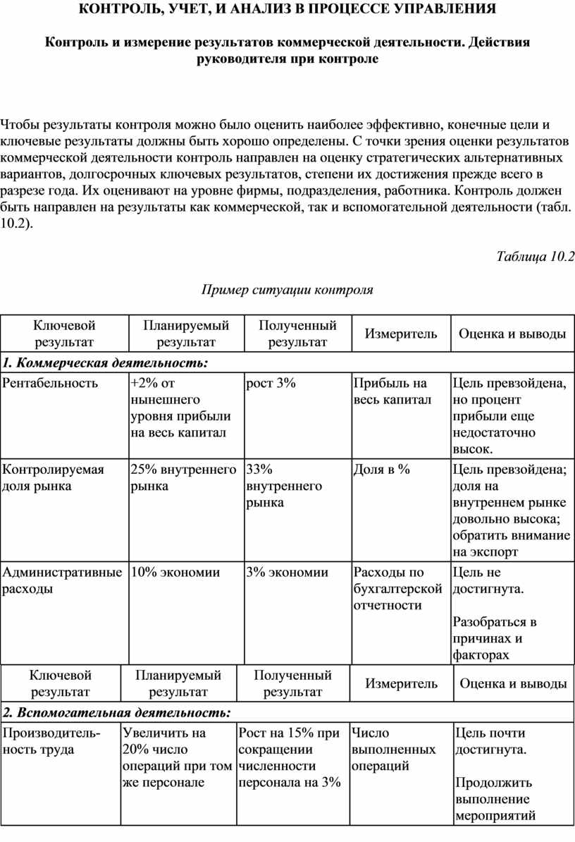Чтобы результаты контроля можно было оценить наиболее эффективно, конечные цели и ключевые результаты должны быть хорошо определены. С точки зрения оценки результатов коммерческой деятельности контроль направлен на оценку стратегических альтернативных вариантов, долгосрочных ключевых результатов, степени их достижения прежде всего в разрезе года. Их оценивают на уровне фирмы, подразделения, работника. Контроль должен быть направлен на результаты как коммерческой, так и вспомогательной деятельности (табл. 10.2).