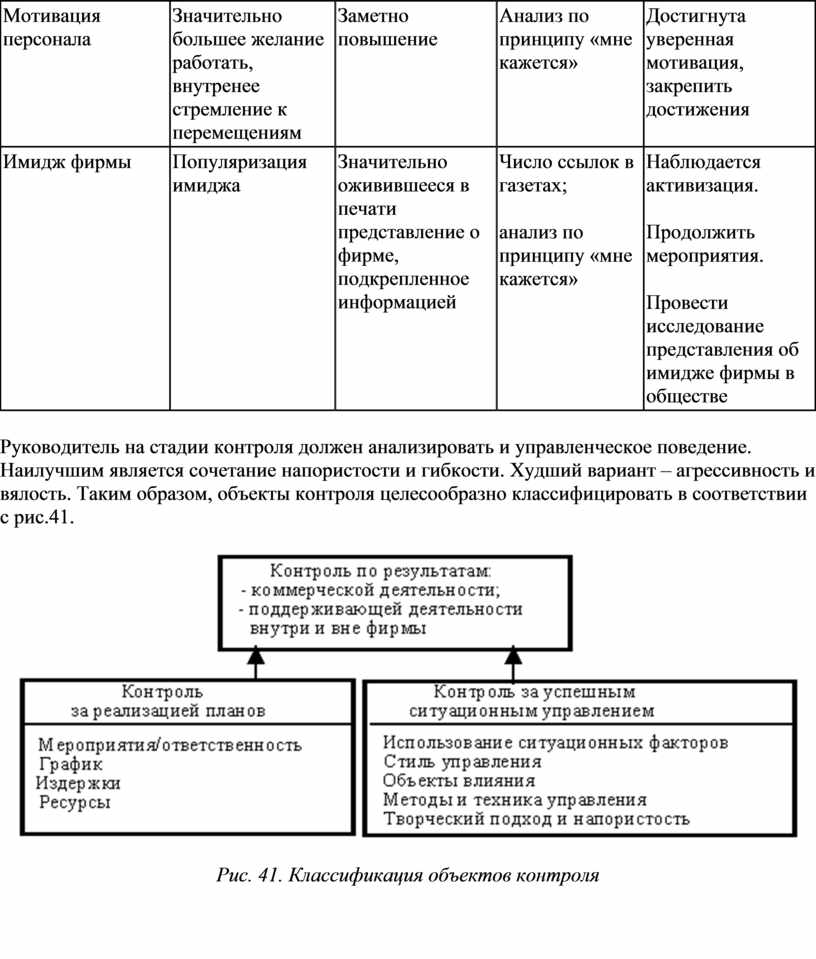 Руководитель на стадии контроля должен анализировать и управленческое поведение. Наилучшим является сочетание напористости и гибкости. Худший вариант – агрессивность и вялость. Таким образом, объекты контроля целесообразно классифицировать в соответствии с рис.41.