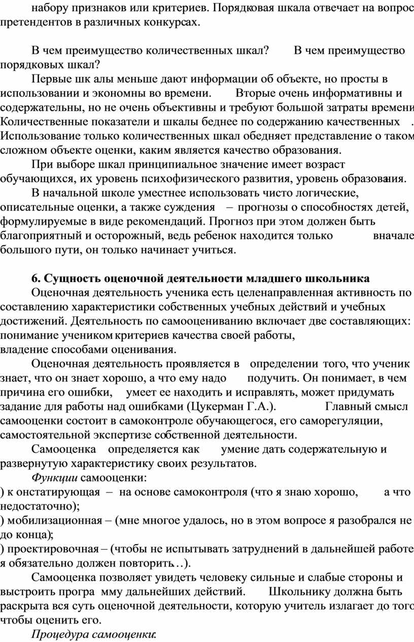 Оценочная деятельность проявляется в определении того, что ученик знает, что он знает хорошо, а что ему надо подучить. Он понимает, в чем причина его ошибки, умеет ее находить и исправлять, может придумать задание для работы над ошибками (Цукерман Г.А.). Главный смысл самооценки состоит в самоконтроле обучающегося, его саморегуляции, самостоятельной экспертизе собственной деятельности.