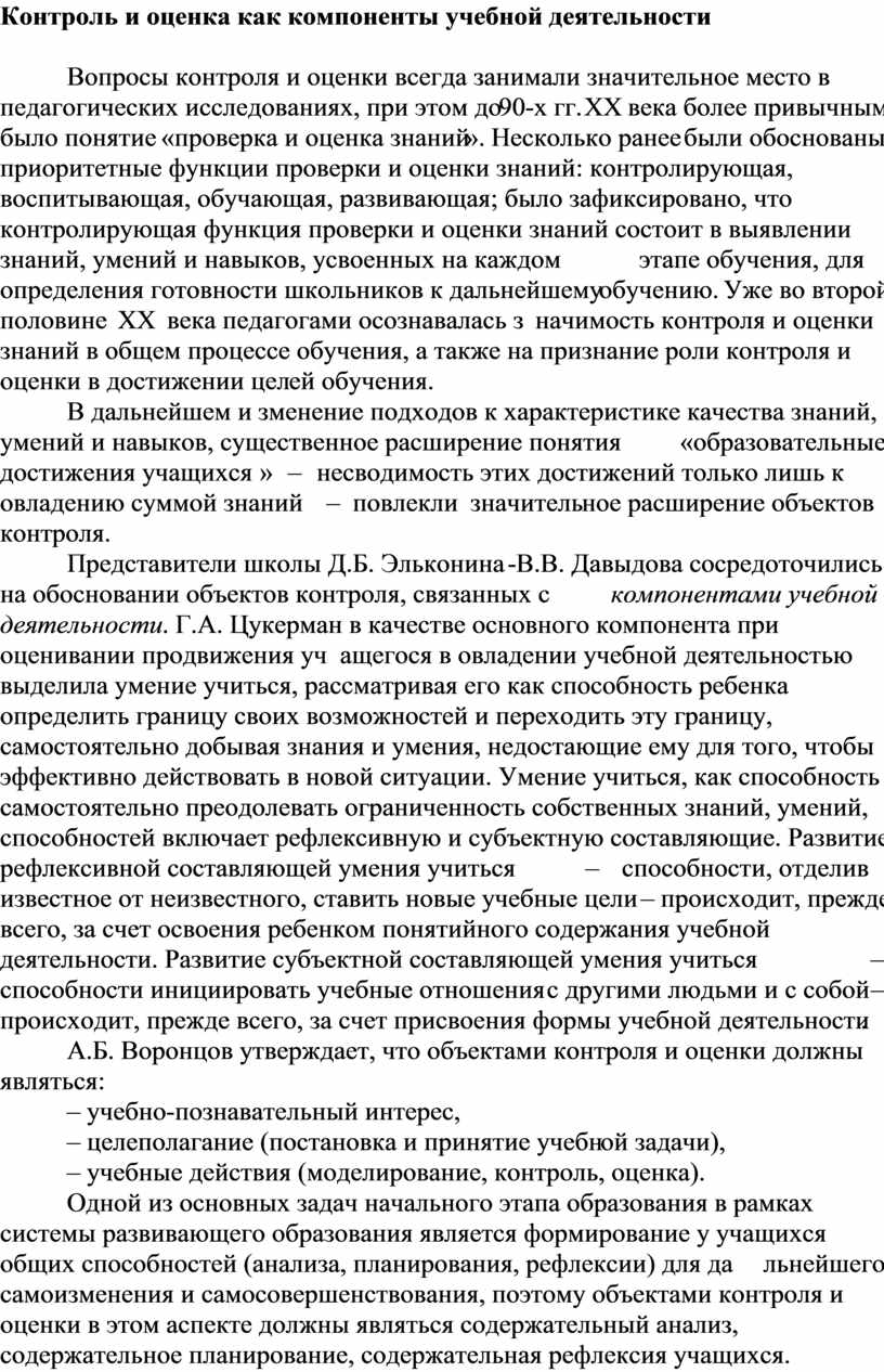 Представители школы Д.Б. Эльконина-В.В. Давыдова сосредоточились на обосновании объектов контроля, связанных с компонентами учебной деятельности. Г.А. Цукерман в качестве основного компонента при оценивании продвижения учащегося в овладении учебной деятельностью выделила умение учиться, рассматривая его как способность ребенка определить границу своих возможностей и переходить эту границу, самостоятельно добывая знания и умения, недостающие ему для того, чтобы эффективно действовать в новой ситуации. Умение учиться, как способность самостоятельно преодолевать ограниченность собственных знаний, умений, способностей включает рефлексивную и субъектную составляющие. Развитие рефлексивной составляющей умения учиться – способности, отделив известное от неизвестного, ставить новые учебные цели – происходит, прежде всего, за счет освоения ребенком понятийного содержания учебной деятельности. Развитие субъектной составляющей умения учиться –способности инициировать учебные отношения с другими людьми и с собой – происходит, прежде всего, за счет присвоения формы учебной деятельности.
