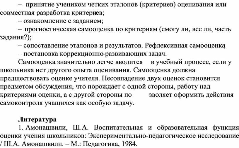 1. Амонашвили, Ш.А. Воспитательная и образовательная функция оценки учения школьников: Экспериментально-педагогическое исследование / Ш.А. Амонашвили. – М.: Педагогика, 1984.