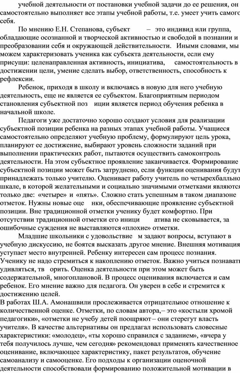 Педагоги уже достаточно хорошо создают условия для реализации субъектной позиции ребенка на разных этапах учебной работы. Учащиеся самостоятельно определяют учебную проблему, формулируют цель урока, планируют ее достижение, выбирают уровень сложности заданий при выполнении практических работ, пытаются осуществить самоконтроль деятельности. На этом субъектное проявление заканчивается. Формирование субъектной позиции может быть затруднено, если функции оценивания будут принадлежать только учителю. Оценивает работу учитель по четырехбалльной шкале, в которой желательными и социально значимыми отметками являются только две: «четыре» и «пять». Сложно стать успешным в таком диапазоне отметок. Нужны новые оценки, обеспечивающие проявление субъектной позиции. Вне традиционной отметки ученику будет комфортно. При отсутствии традиционной отметки его инициатива не сковывается, за ошибочные суждения не выставляются «плохие» отметки.