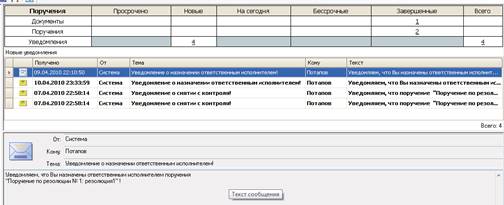 Исполнителям поручений (согласований) и контролерам исполнения документа системой автоматически рассылаются уведомления о том, что они назначены выполнять эти функции, а также напоминания о сроках исполне- ния поручений (согласований) (рис. 16.8).