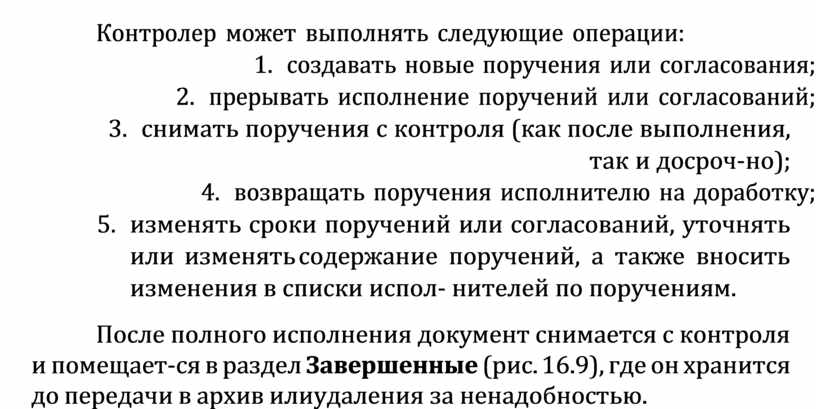 3) снятие поручений или цепочки поручений с контроля (выполняет- ся контролером);