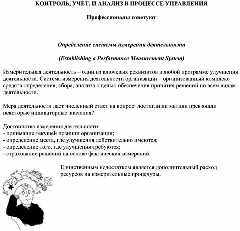 Измерительная деятельность – один из ключевых реквизитов в любой программе улучшения деятельности. Система измерения деятельности организации – организованный комплекс средств определения, сбора, анализа с целью обеспечения принятия решений по всем видам деятельности.