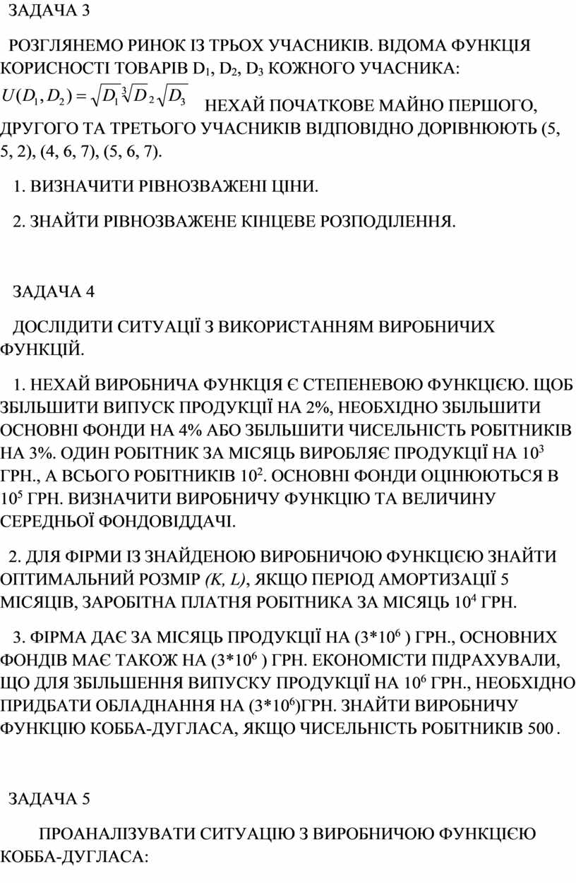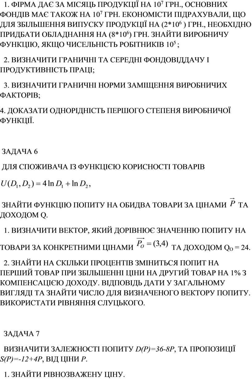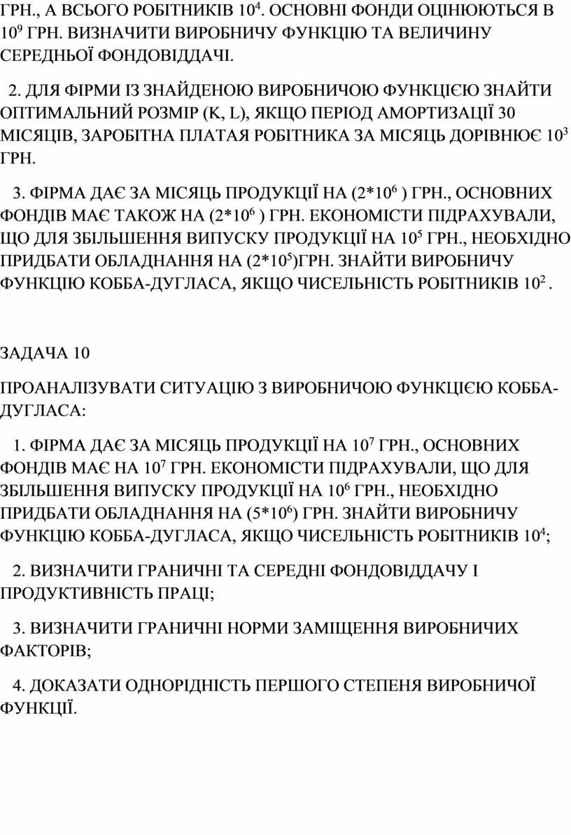 1. Нехай виробнича функція є степеневою функцією. Щоб збільшити випуск продукції на 2%, необхідно збільшити основні фонди на 4% або збільшити чисельність робітників на 3%. Один робітник за місяць виробляє продукції на 103 грн., а всього робітників 102. Основні фонди оцінюються в 105 грн. Визначити виробничу функцію та величину середньої фондовіддачі.