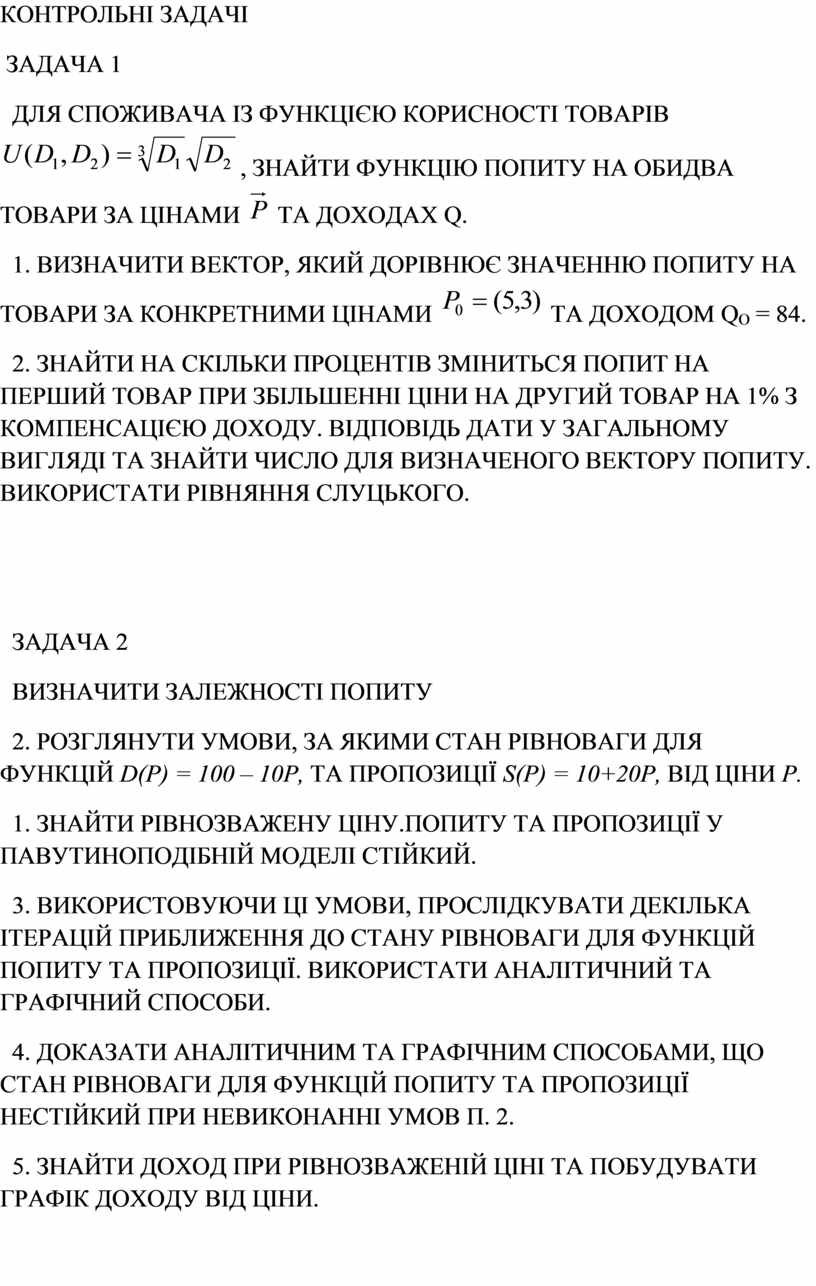 2. Розглянути умови, за якими стан рівноваги для функцій D(p) = 100 – 10p, та пропозиції S(p) = 10+20p, від ціни р.
