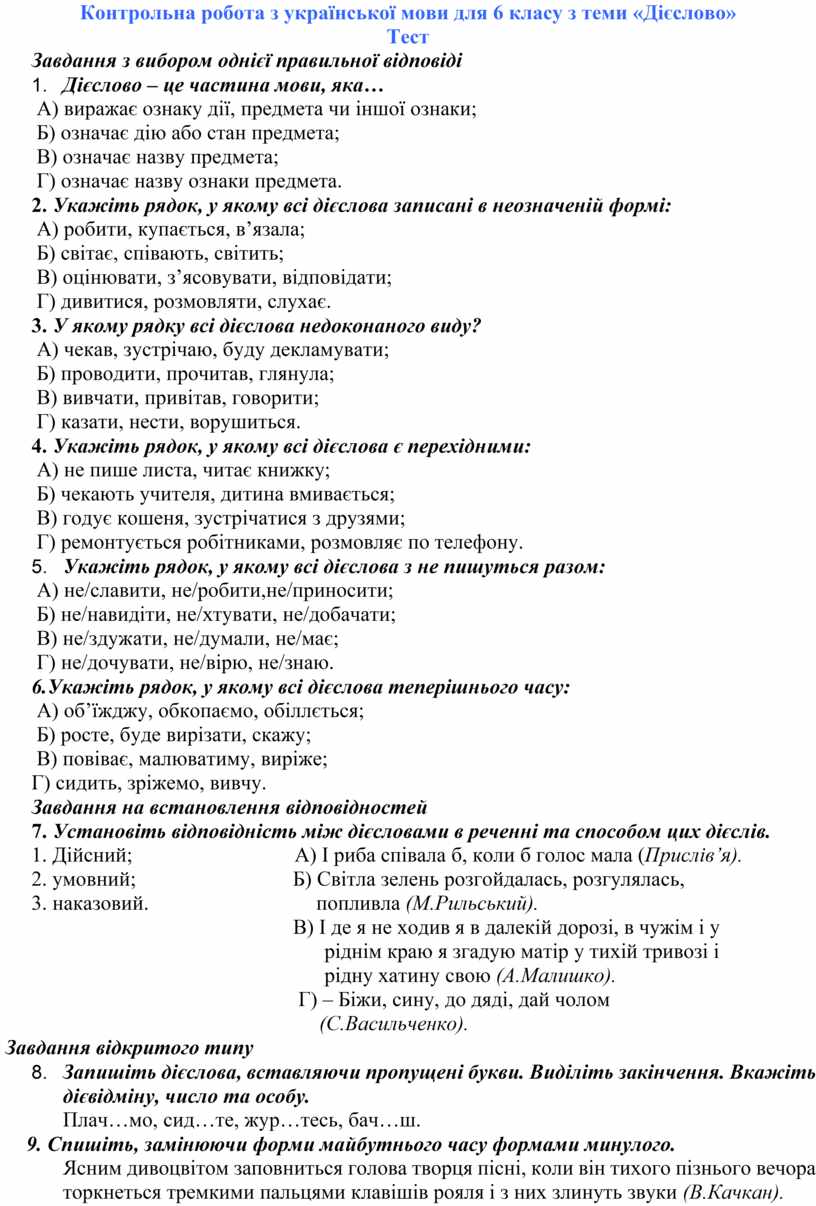 Контрольна робота з української мови для 6 класу з теми «Дієслово»