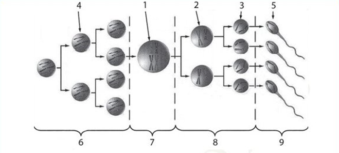 6. Установите соответствие между характеристиками и типами клеток в сперматогенезе, обозначенными цифрами на схеме выше: к каждой позиции, данной в первом столбце, подберите соответствующую позицию из второго столбца.