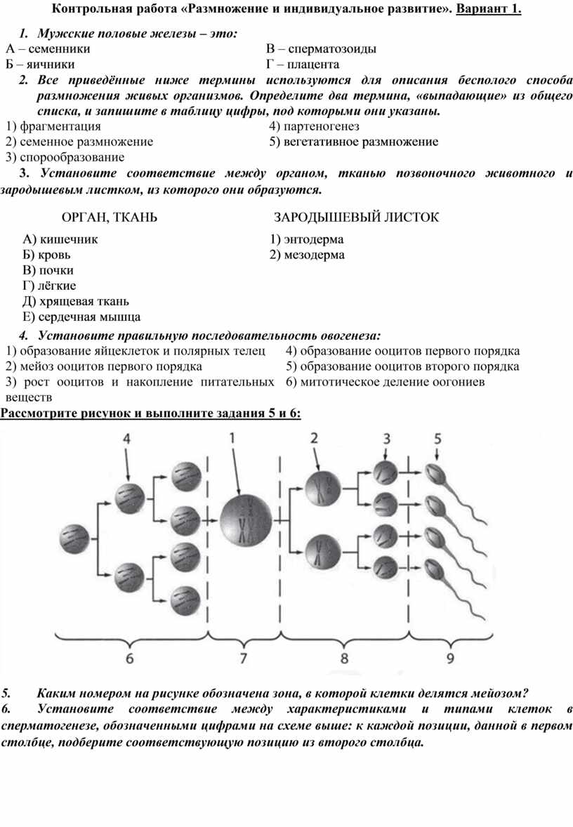 Контрольная работа «Размножение и индивидуальное развитие». Вариант 1.