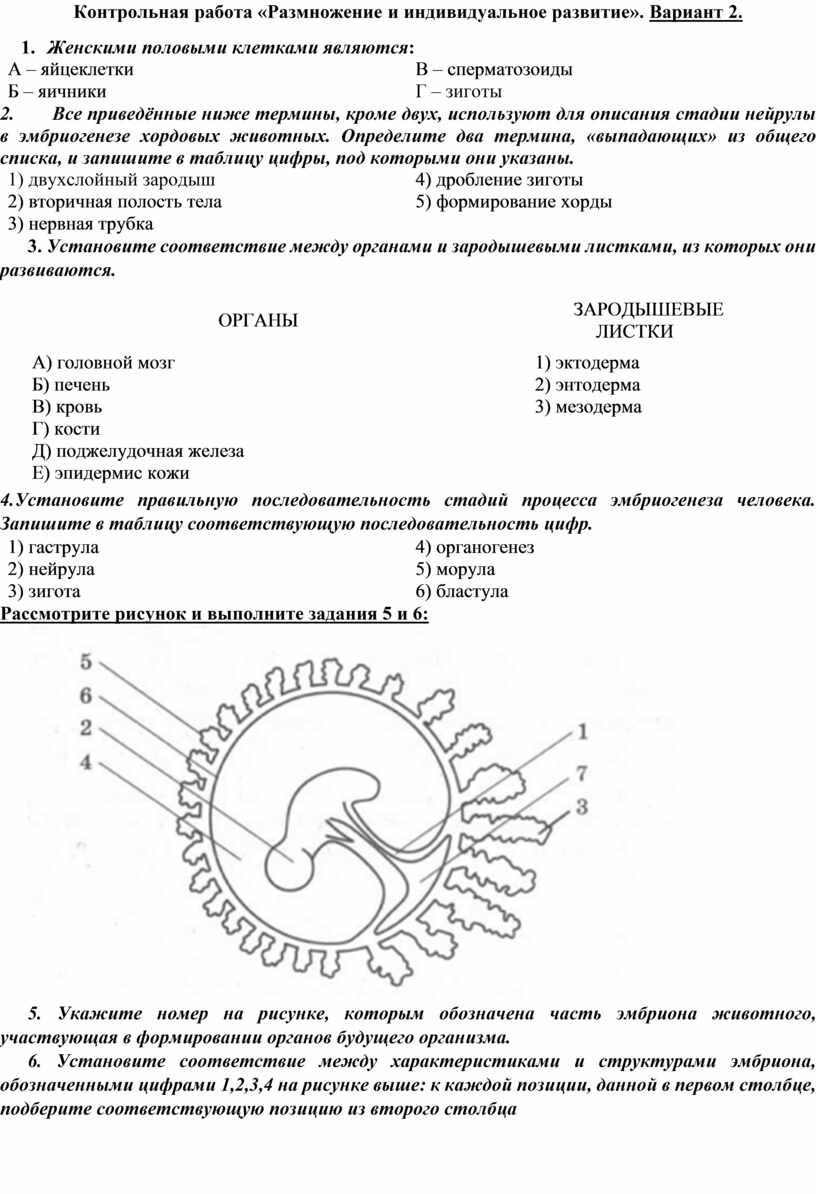 Контрольная работа «Размножение и индивидуальное развитие». Вариант 2.