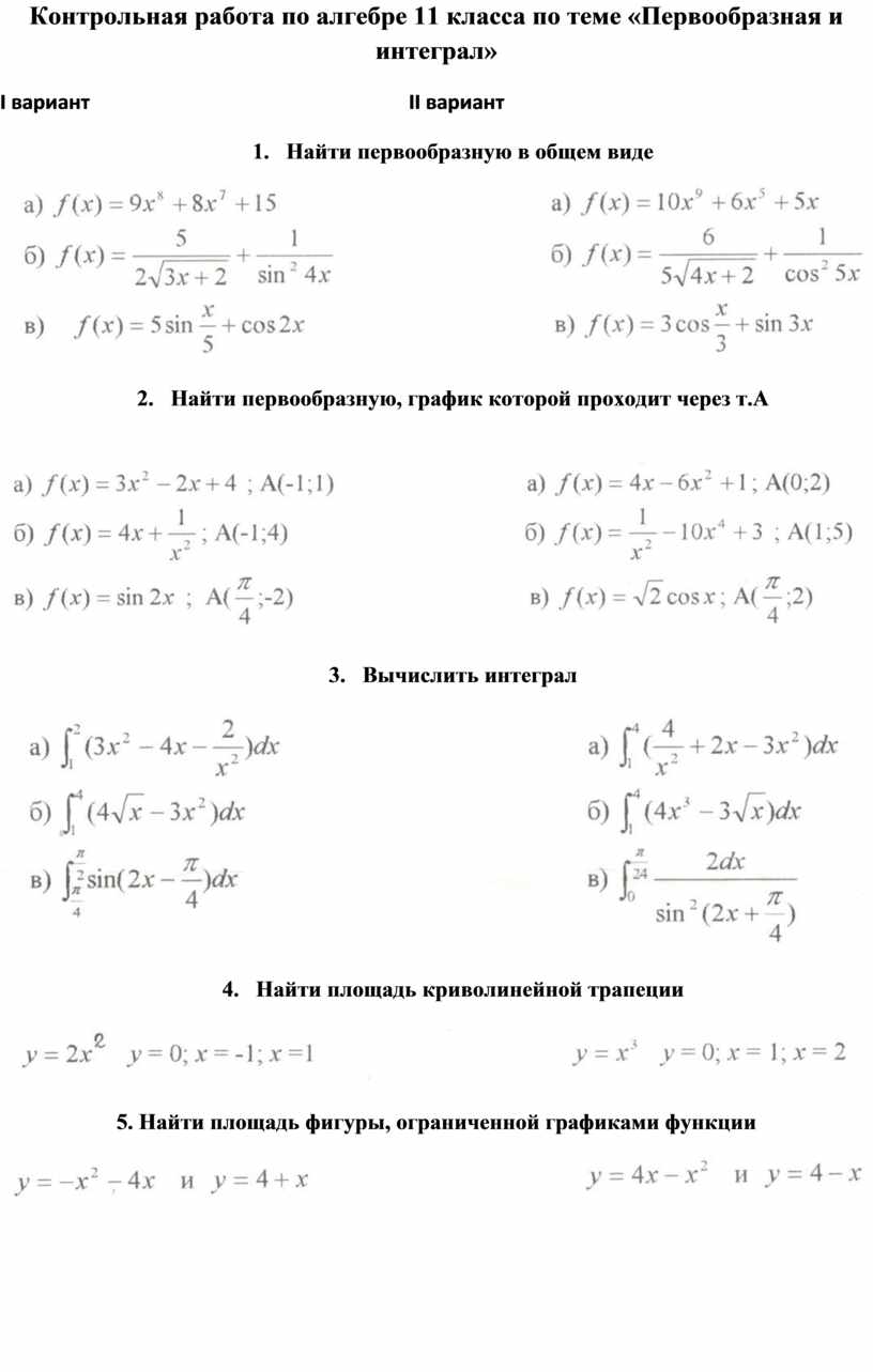 Контрольная работа по алгебре 11 класса по теме «Первообразная и интеграл»