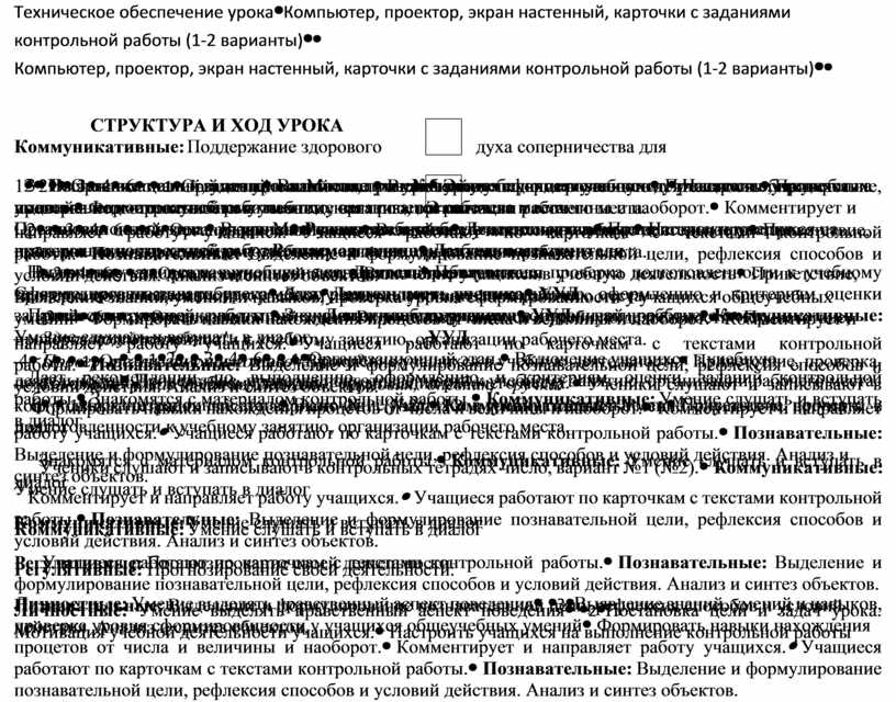 Компьютер, проектор, экран настенный, карточки с заданиями контрольной работы (1-2 варианты) |