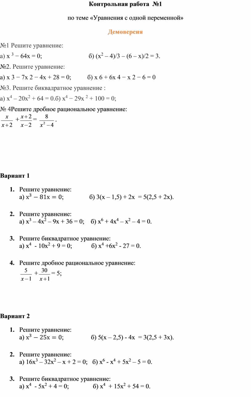 а) x 3 − 64x = 0; б) (x2 – 4)/3 – (6 – x)/2 = 3.
