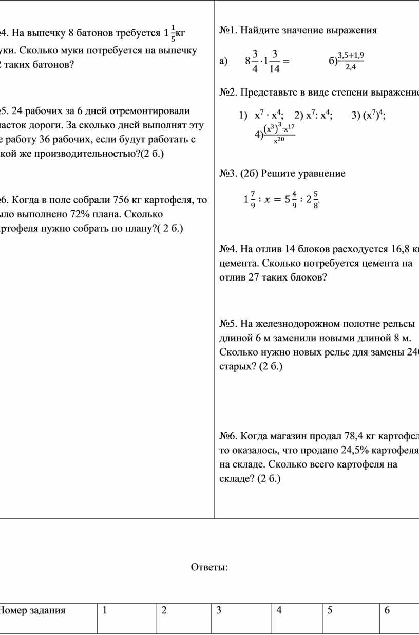 №6. Когда в поле собрали 756 кг картофеля, то было выполнено 72% плана. Сколько картофеля нужно собрать по плану?( 2 б.)