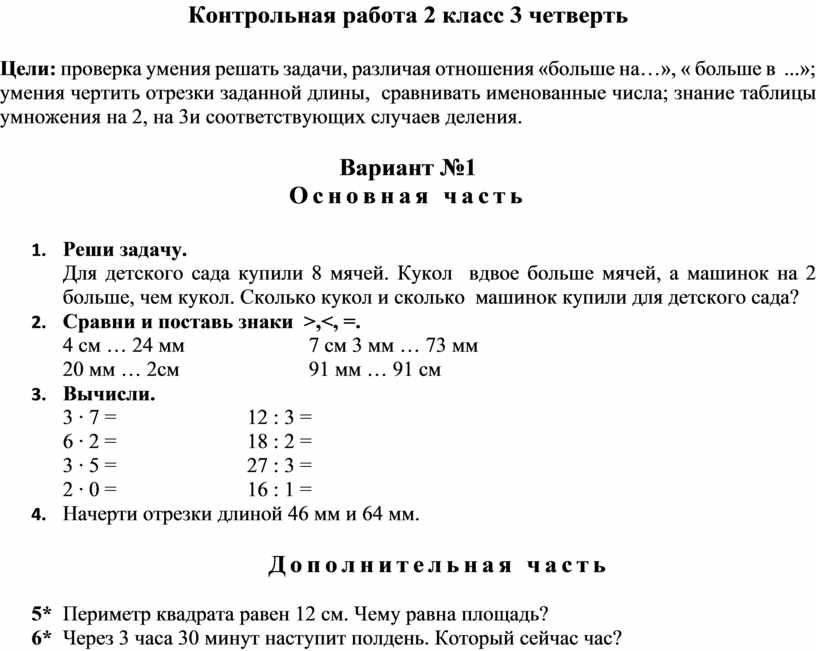 Цели: проверка умения решать задачи, различая отношения «больше на…», « больше в ...»; умения чертить отрезки заданной длины, сравнивать именованные числа; знание таблицы умножения на 2, на 3и соответствующих случаев деления.