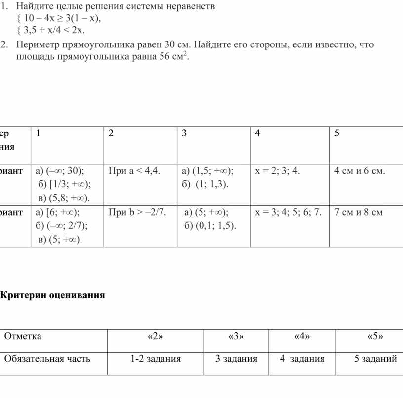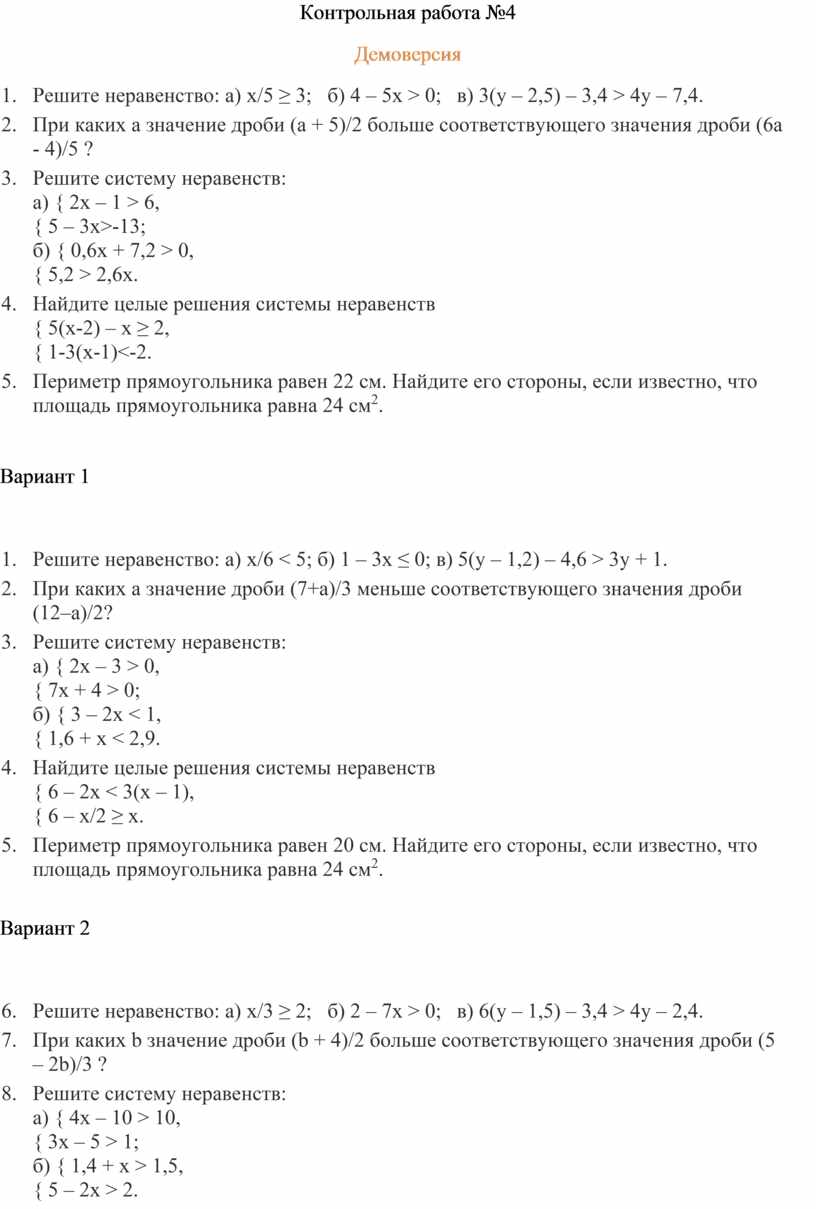 1. Решите неравенство: а) х/5 ≥ 3; б) 4 – 5х > 0; в) 3(у – 2,5) – 3,4 > 4y – 7,4.