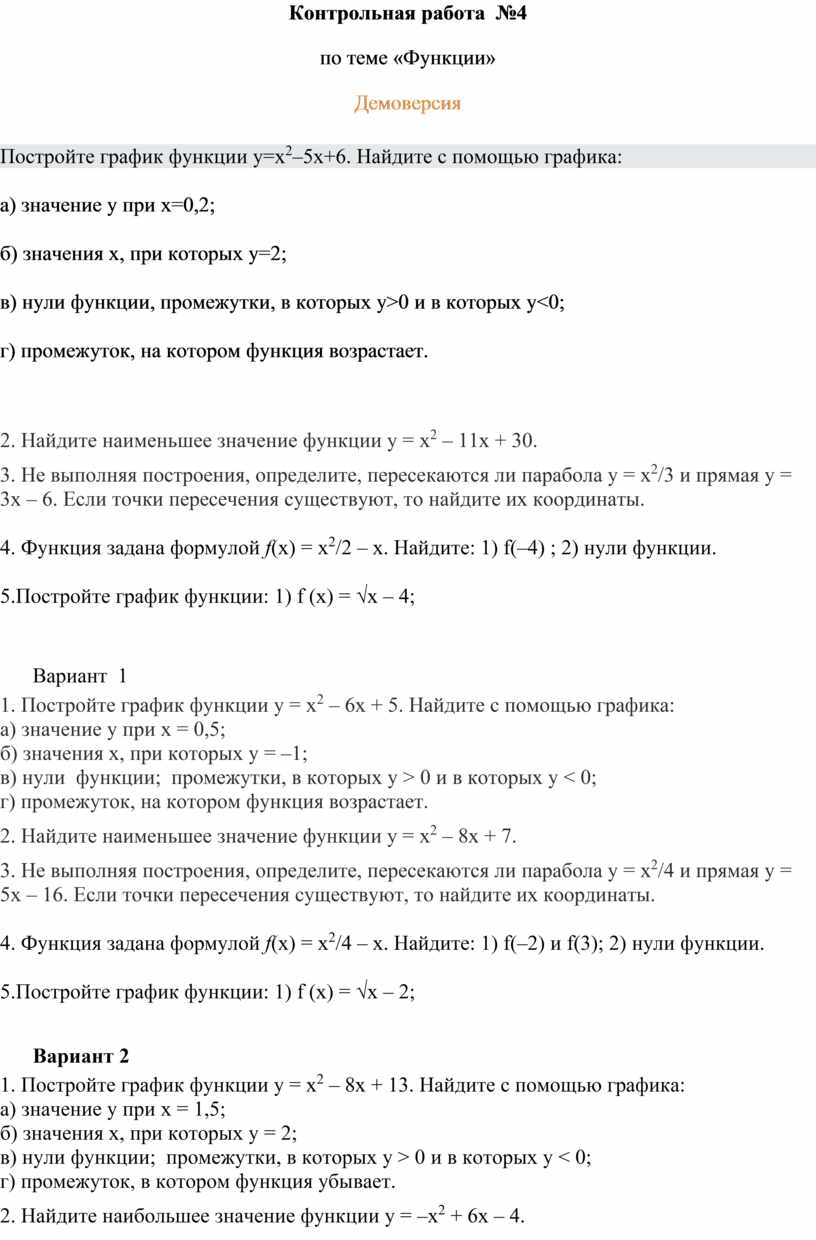 4. Функция задана формулой f(х) = х2/2 – х. Найдите: 1) f(–4) ; 2) нули функции.