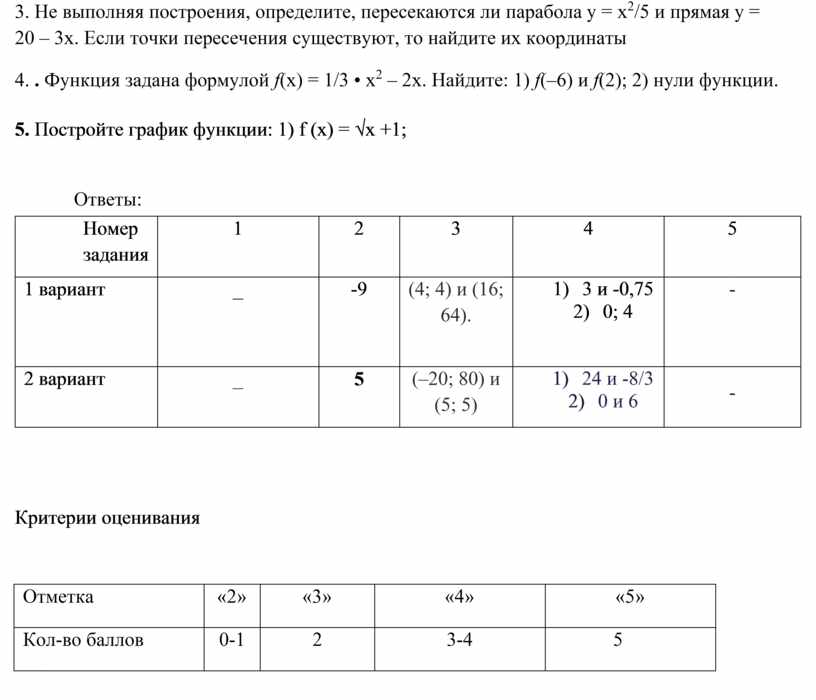 3. Не выполняя построения, определите, пересекаются ли парабола у = х2/5 и прямая у = 20 – 3х. Если точки пересечения существуют, то найдите их координаты