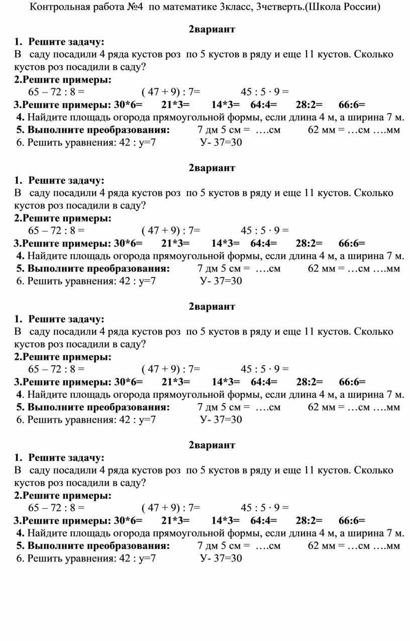 Контрольная работа №4 по математике 3класс, 3четверть.(Школа России)