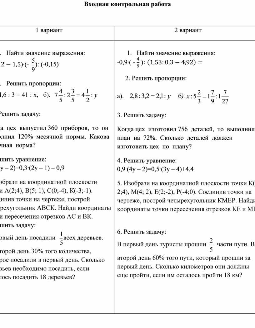 а). 24,6 : 3 = 41 : х, б). 3. Решить задачу: Когда цех выпустил 360 приборов, то он выполнил 120% месячной нормы. Какова месячная норма? 4. Решить уравнение: 0,2(5у – 2)=0,3∙(2у – 1) – 0,9 5.Изобрази на координатной плоскости точки А(2;4), В(5; 1), С(0;-4), К(-3;-1). Соединив точки на чертеже, построй четырехугольник АВСК. Найди координаты точки пересечения отрезков АС и ВК. 6. Решить задачу: В первый день посадили |