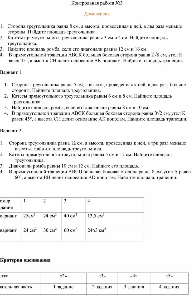 1. Сторона треугольника равна 8 см, а высота, проведенная к ней, в два раза меньше стороны. Найдите площадь треугольника.
