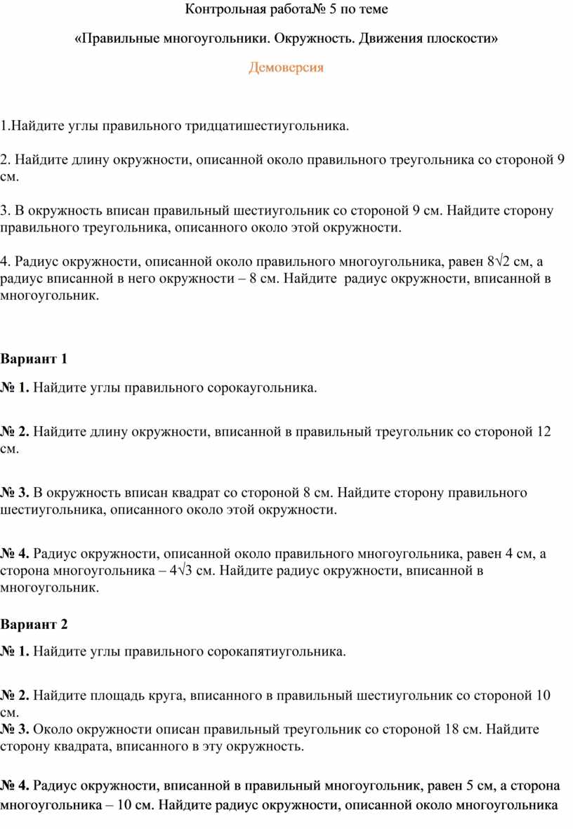 «Правильные многоугольники. Окружность. Движения плоскости»