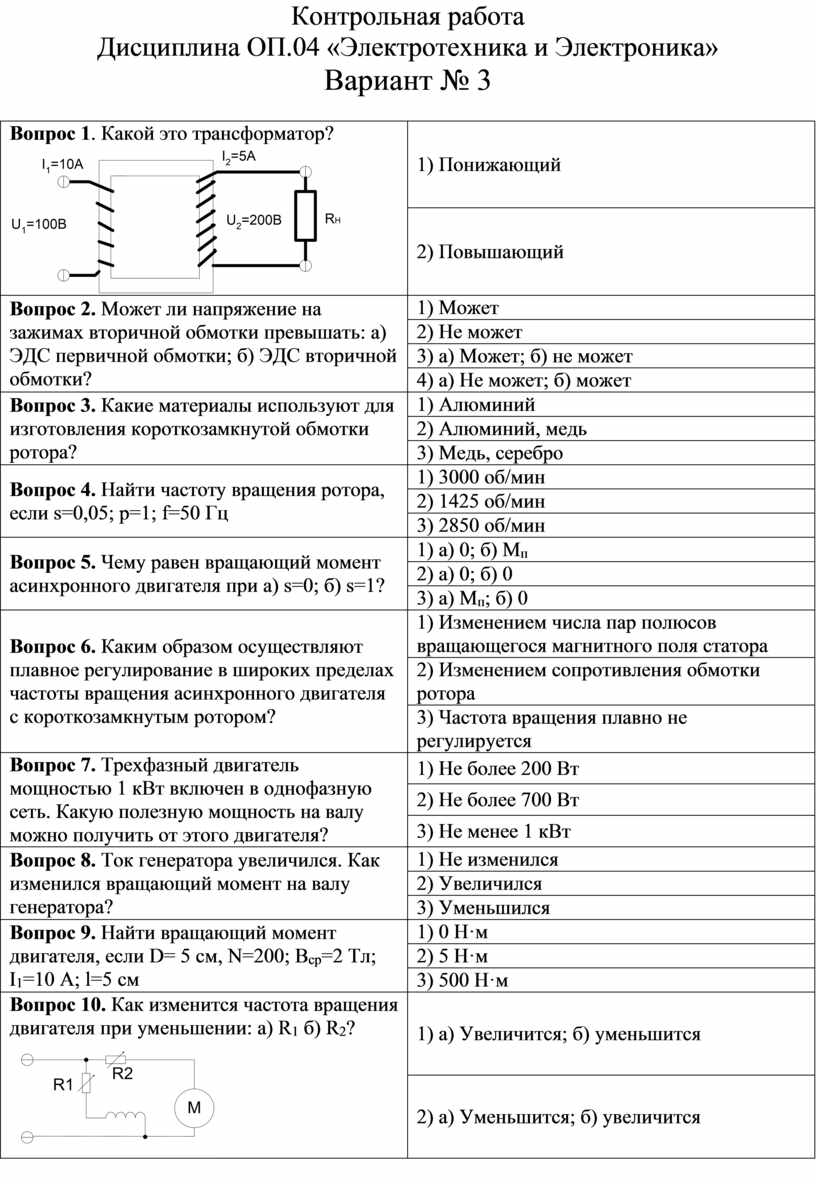 Вопрос 10. Как изменится частота вращения двигателя при уменьшении: а) R1 б) R2?