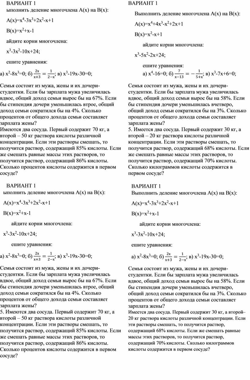 5. Имеются два сосуда. Первый содержит 70 кг, а второй – 50 кг раствора кислоты различной концентрации. Если эти растворы смешать, то получится раствор, содержащий 85% кислоты. Если же смешать равные массы этих растворов, то получится раствор, содержащий 86% кислоты. Сколько процентов кислоты содержится в первом сосуде?