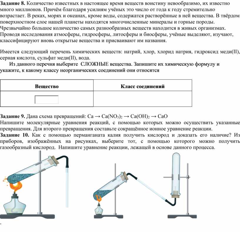 Задание 10. Как с помощью перманганата калия получить кислород и доказать его наличие? Из приборов, изображённых на рисунках, выберите тот, с помощью которого можно получить газообразный кислород. Напишите уравнение реакции, лежащей в основе данного процесса.