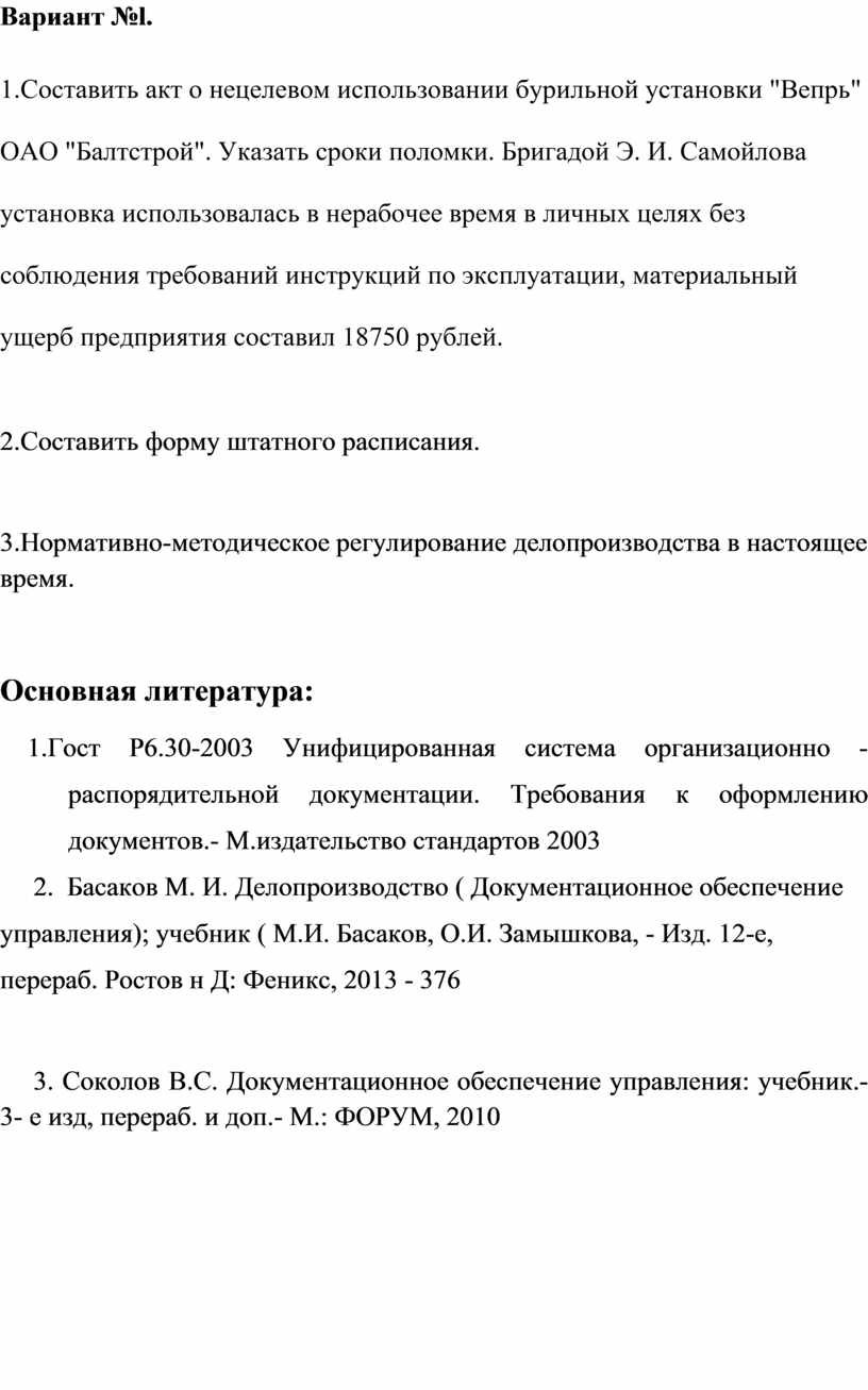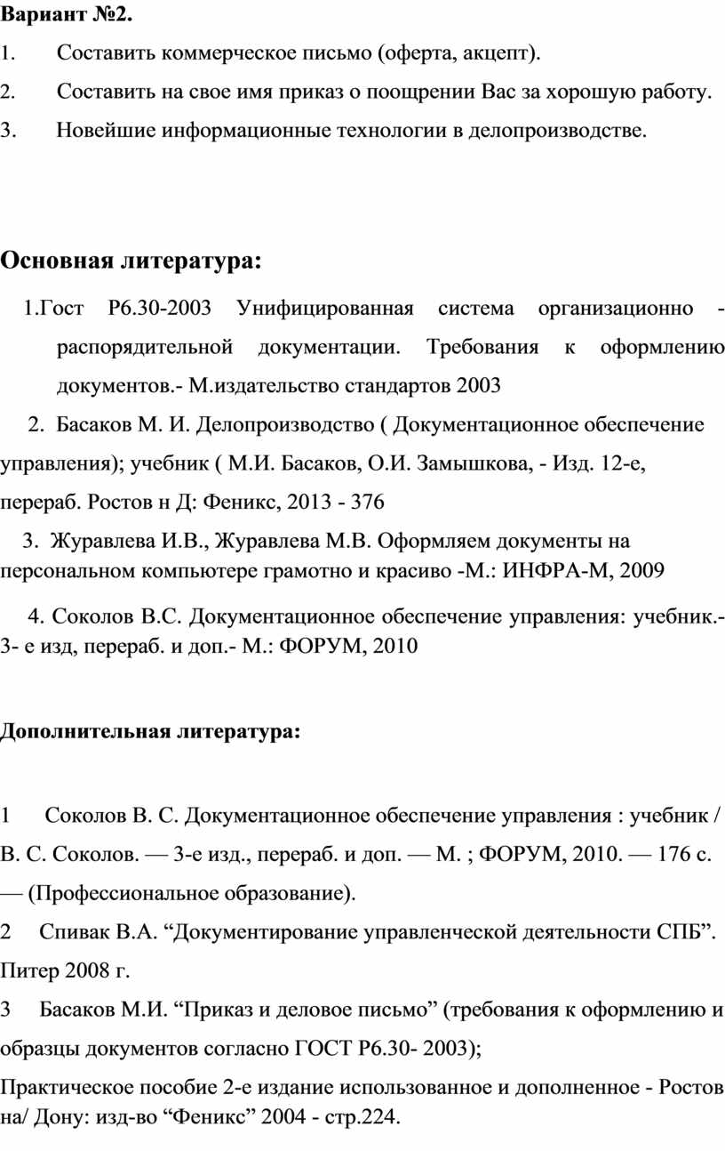 3 Басаков М.И. “Приказ и деловое письмо” (требования к оформлению и образцы документов согласно ГОСТ Р6.30- 2003);