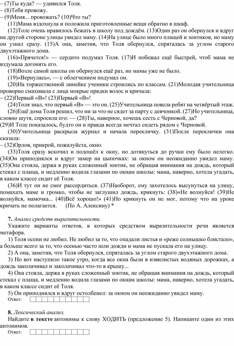 (33)Толя сразу вскочил и подошёл к окну, но дотянуться до ручки ему было нелегко. (34)Он приподнялся и вдруг замер на цыпочках: за окном он неожиданно увидел маму. (35)Она стояла, держа в руках сложенный зонтик, не обращая внимания на дождь, который стекал с плаща, и медленно водила глазами по окнам школы: мама, наверно, хотела угадать, в каком классе сидит её Толя.