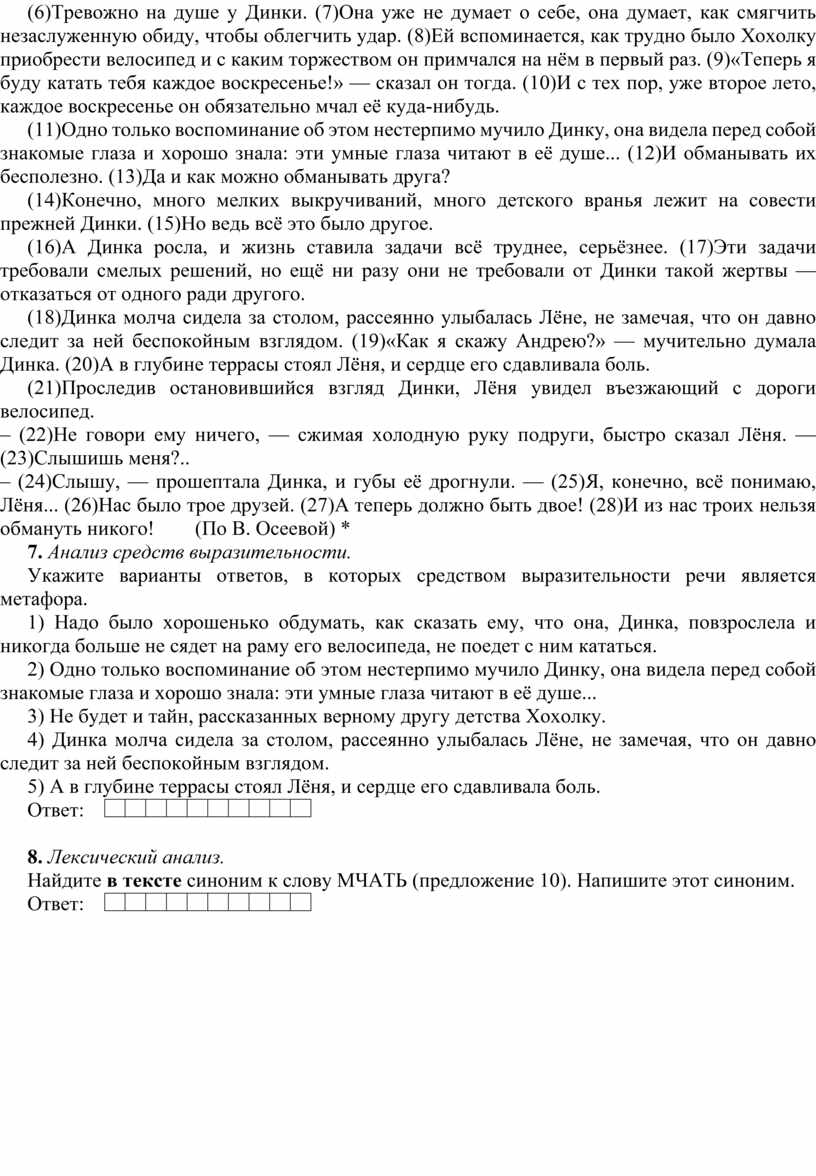 – (24)Слышу, — прошептала Динка, и губы её дрогнули. — (25)Я, конечно, всё понимаю, Лёня... (26)Нас было трое друзей. (27)А теперь должно быть двое! (28)И из нас троих нельзя обмануть никого! (По В. Осеевой) *