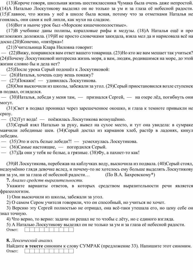 (39)И Лоскутикова, перебежав на каблучках воду, выскочила из подвала. (40)Серый стоял, недоумённо глядя девочке вслед, и почему-то не хотелось ему больше выделять Лоскутикову ни за ум, ни за глаза её небесной радости… (По В.А. Бахревскому*)