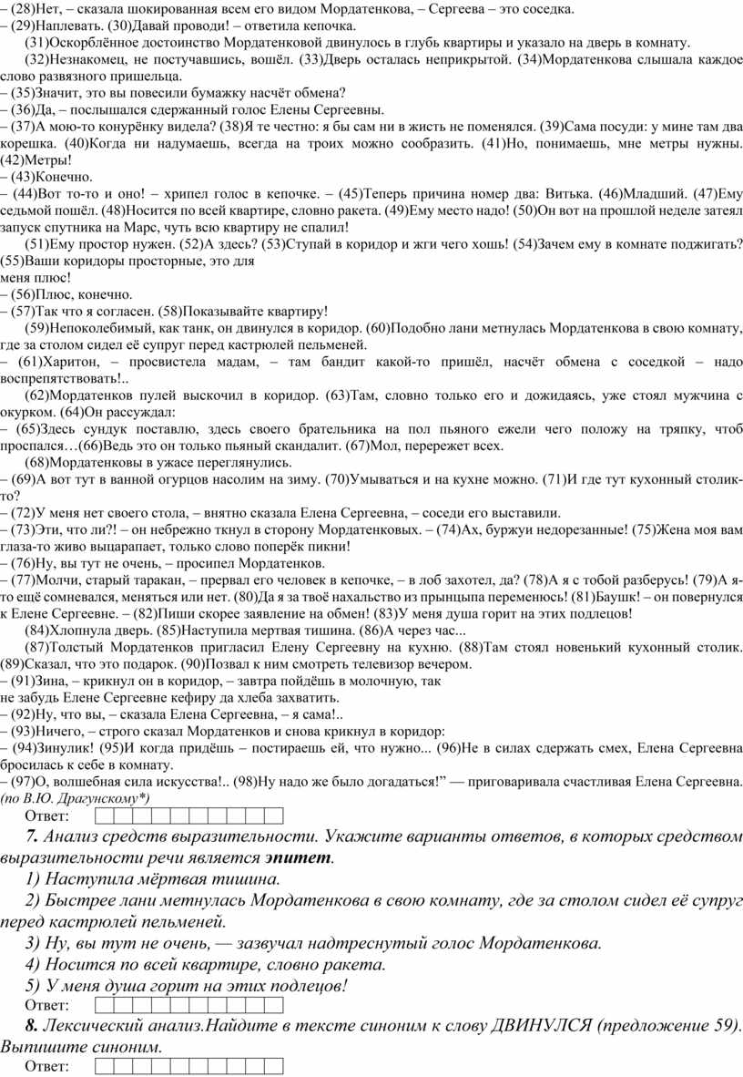 (32)Незнакомец, не постучавшись, вошёл. (33)Дверь осталась неприкрытой. (34)Мордатенкова слышала каждое слово развязного пришельца.