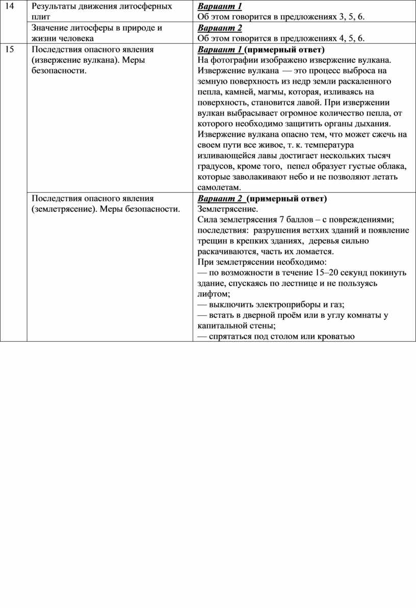 Вариант 2 (примерный ответ) Землетрясение. 1. Сила землетрясения 7 баллов – с повреждениями; a. последствия: разрушения ветхих зданий и появление трещин в крепких зданиях, деревья сильно раскачиваются, часть их ломается. При землетрясении необходимо: — по возможности в течение 15–20 секунд покинуть здание, спускаясь по лестнице и не пользуясь лифтом; — выключить электроприборы и газ; — встать в дверной проём или в углу комнаты у капитальной стены; — спрятаться под столом или кроватью |